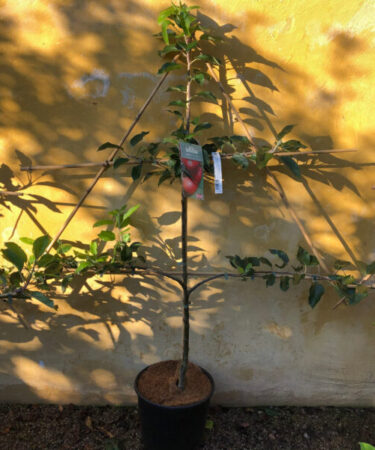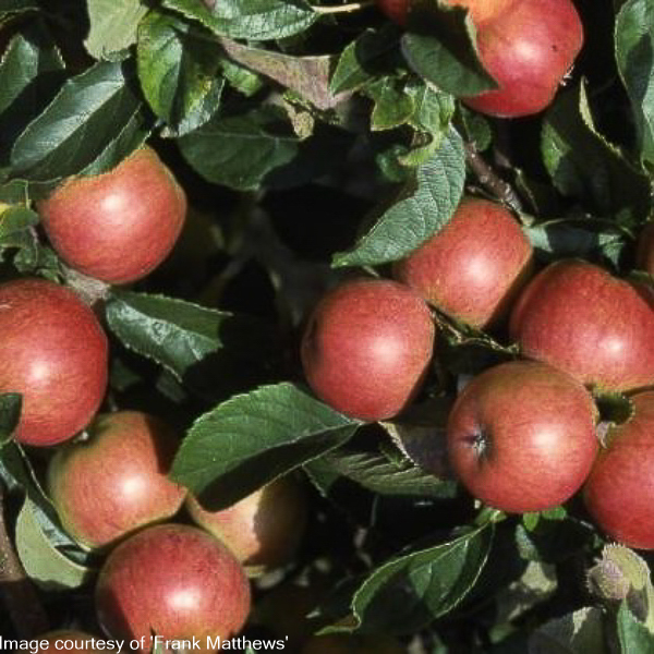 Espalier. An improved form of this well known eater. Apples: orange flush over greenish yellow. Deep cream flesh with a sweet, aromatic flavour. Good for juicing. Pick fruit October. Very self fertile. Semi vigorous rootstock: Ht 3.5-4 metres in 10 years.