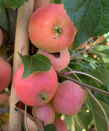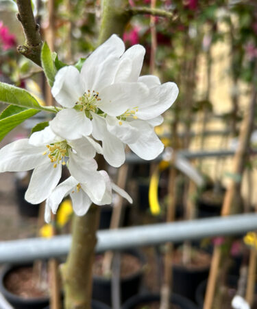 Crab apple. Large orange pink fruit persist much longer than most. White blossom covers this compact tree. Makes excellent jelly. Ht 6-8ft in 10 years.
