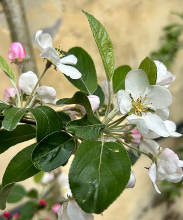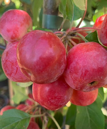 Dark green foliage, open cup-shaped white flowers in late spring. In autumn, branches are weighed down by a profusion of deep red crab apples and last through winter. Any fertile soil.