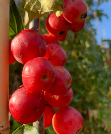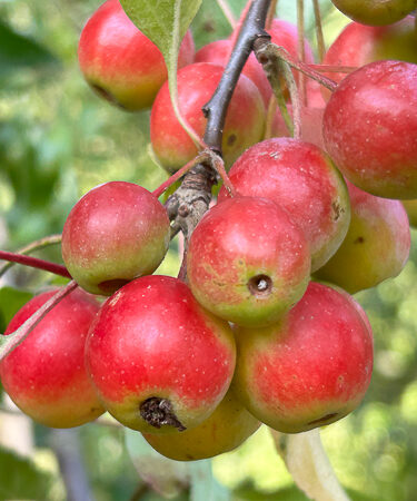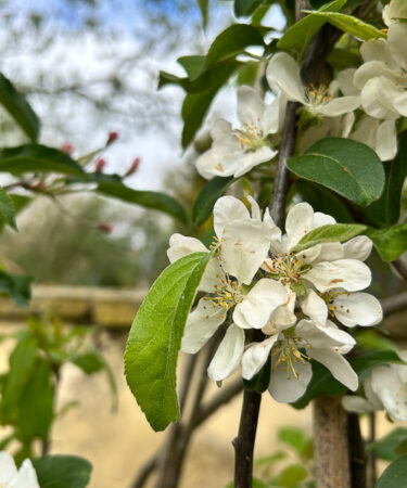 ‘Ornamental crab apple’. Small tree. Clusters of ‘apple blossom white’ flowers. Glossy red persistant fruit. Disease resistant. Highly recommended.
