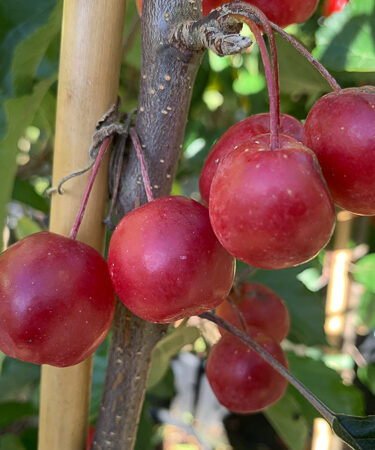 ‘Ornamental crab apple’. Small tree. Clusters of ‘apple blossom white’ flowers. Glossy red persistant fruit. Disease resistant. Highly recommended.