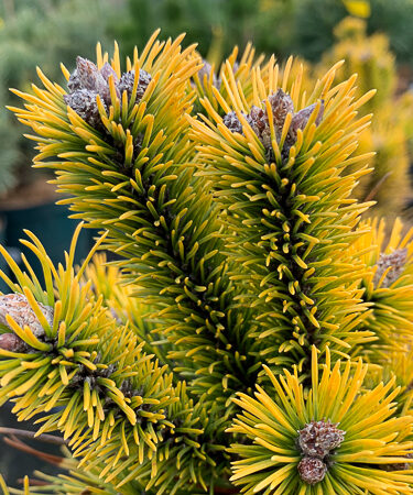 A lovely dwarf pine. Golden needles especially bright in winter. Good for pot culture. Forms a neat rounded shape. Growth 1-2″ per year. Very hardy. Full sun. Any well drained soil.