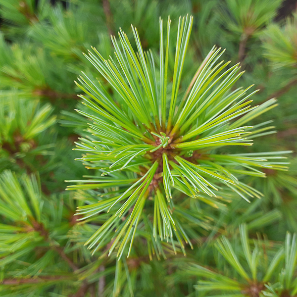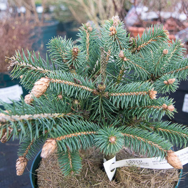 A lovely dwarf. Forming a dense compact mound of fine soft needles. Lime green when young. Cones produced on young plants. Growth 18″ in ten years.