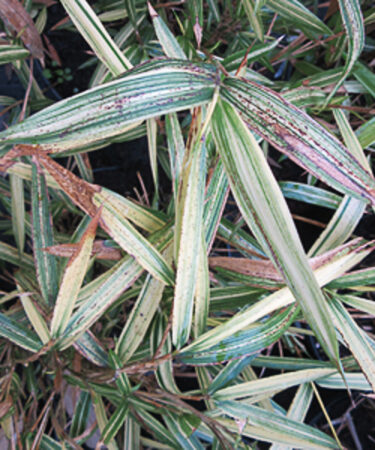 Small bamboo with green leaves. Makes excellent ground cover. Suitable for low hedges. Ht 2-3ft. Very hardy. Part shade or sun. Rich moist soil.