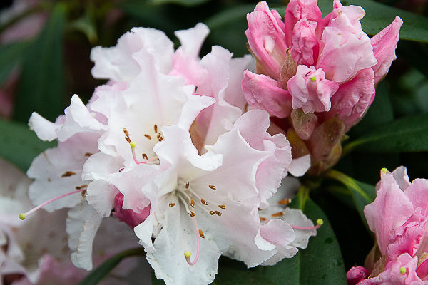 Rhododendron ‘Christmas Cheer’ AGM An old rhododendron hybrid. Dense and compact habit. Flowers pink in bud, opening blush pink and fading to very pale pink. Flws Christmas to April. Ht 4ft. Moist acid soil, part shade.