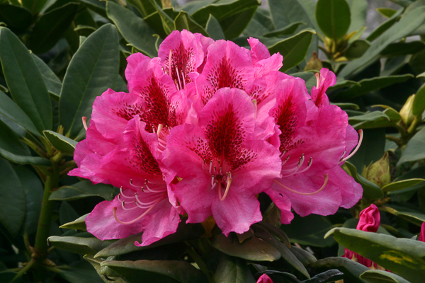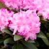 Rhododendron ‘Cosmopolitan’ A medium sized dense shrub with dark green glossy foliage. In May bears light pink flowers with a deep red flare. Requires neutral or acid soil. Ht 6ft