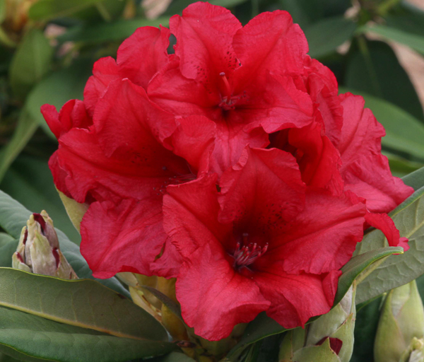 Rhododendron ‘Dopey’ AGM A deep red yakushimanum hybrid and one of the seven dwarf series. Compact habit with dense, light green foliage. Long lasting red flws with dark spots in upright trusses, May-June. Ht & Spr 80-100cm (upto 3ft) in 10 years. Acid soil. Dappled shade.