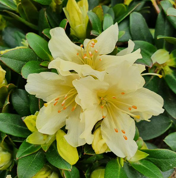 A semi-dwarf, evergreen shrub with dark leaves. It’s yellow, trumpet-shaped blooms appear towards the end of spring (April-May). Ht of up to 1m in 10 years. Acid soil. Sun/ part shade.