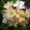 Rhododendron ‘Horizon Monarch’ AGM ‘Nancy Evans x Pont Defiance’. A lovely variety with very heavy trusses of pale greenish yellow flowers with small vivid red flare opening from red buds. Flws: May-Jun. Leathery deep green leaves. Ht 6ft in 10 years. An excellent all round plant. Acid soil.