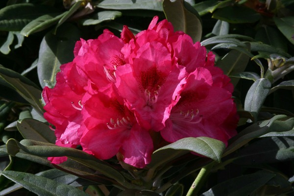 Rhododendron ‘Sneezy’ A compact dwarf yakushimanum hybrid. Distinctive foliage. Large trusses red buds opening rose pink frilly trumpets, darker at edges. Deep red blotch. Flws: May-Jun. Ht 2-3ft. Peaty acid soil, sun or part shade.