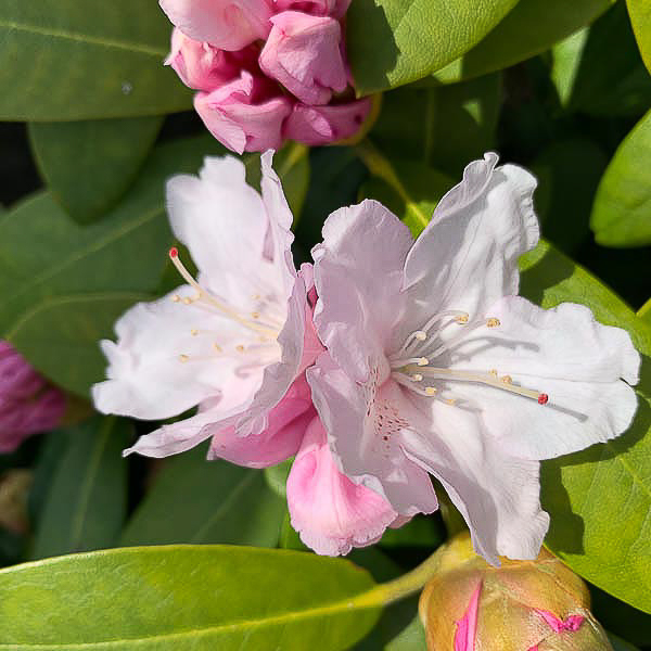 Rhododendron Yak. Schneekrone is a splendid free flowering species forming a compact, dome-shaped bush. Rose coloured buds open to reveal white flowers flushed with pink and delicate red spotting. Flws: May. Ht 3ft in 10 years. Inkarho rhododendron are easier to care for and less demanding in terms of site conditions and cultivation. Lime tolerant and hardy. Any reasonable soil.