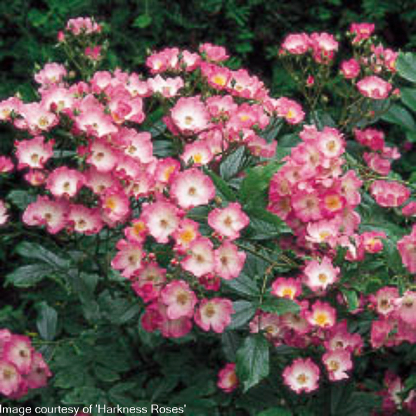 Rosa ‘Ballerina’ AGM ‘Shrub rose: Modern shrub’. Short vigorous shrub with hydrangea heads of small blossom pink, single flws. Very reliable. Free and continuous flowering. Ht 4ft, Spr 4ft. Well drained fertile soil, sun.