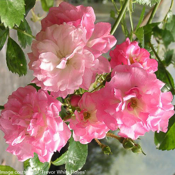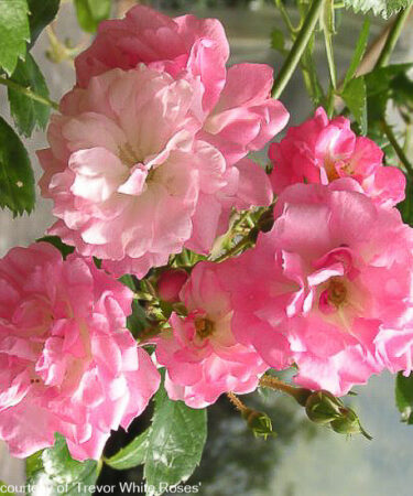 Rosa ‘Blushing Lucy’ ‘Rambler’. Graceful stems bear large clusters of pretty pale pink semi-double flowers with white at base of petals. Scented. Unlike many old ramblers it flws right through the summer and into the autumn. Dense glossy foliage. Size: (15ft) 5m x (12ft) 4 m. Best in a sunny position.