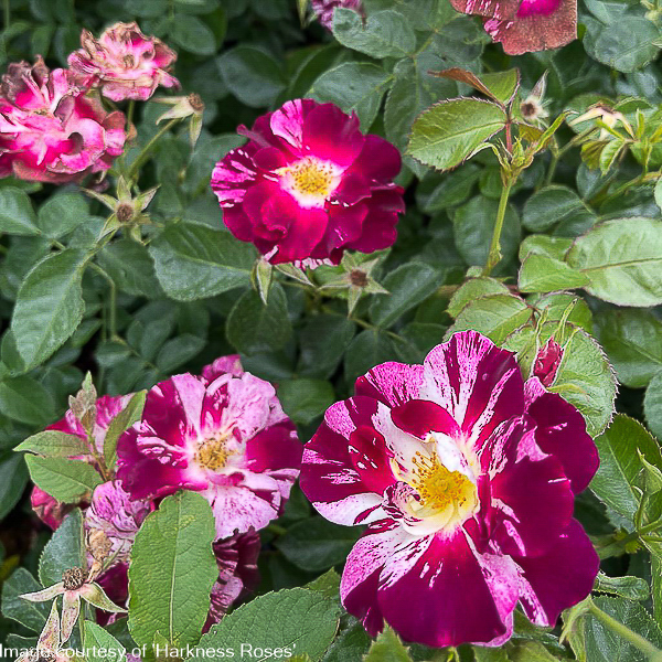Rosa ‘ Cardinal Hume’. A wide growing, bushy shrub rose which has amazing cardinal red to purple blooms, musky fragrance. Clusters of 7 flowers. Greyish, green foliage. Repeat flowering throughout summer until autumn.. Ht 120cm x 100cm. Fertile, well drained soil, sun or part shade.
