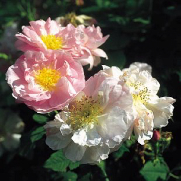 Rosa ‘Celsiana’ ‘Shrub rose: Damask’ Strong bushy growth, grey green foliage lovely contrast with the clusters of large semi- double pearly pink flws with golden stamens. Very scented. Ht 5ft. Suitable for hedges.