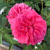 ‘Shrub rose: rugosa’.Clusters of small, frilled, double crimson blooms. A medium vigorous shrub with arching habit. perpetual flowering. Size: 1.2m x 1.2m. Tolerates shade.