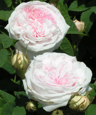 Rosa ‘Felicite Parmentier’ ‘Alba’. A beautiful compact shrub with full 2.5″ densely packed soft pink flowers reflexing to pom-pom, highly scented Jun/Jul, with healthy grey foliage. Ht 4′ by 4′. Well drained soil, sun or shade.