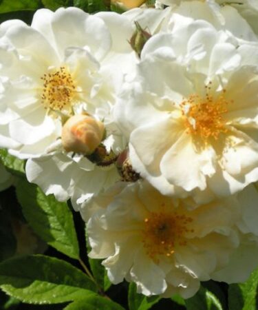 Rosa ‘Goldfinch’ ‘Rambler’ Large clusters of button-like flws, deep yellow fading to milky white with age. Vigorous, bushy growth. Ht 10ft. Strong fragrance. Can be grown as large shrub.