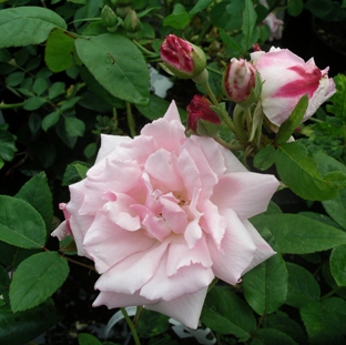 Rosa ‘Kathleen Harrop’ ‘Bourbon climber’ Soft shell pink flws. Very fragrant and free flowering. Thornless. Suitable for north wall. Shade tolerant. Ht 10 x 6ft.
