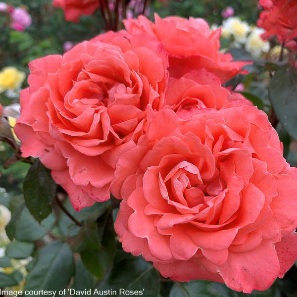 Rosa ‘Olivia’. Olivia has deep orange – almost coral coloured – blooms. Flowers are large and often form clusters. It has a handsome upright shape with dark glossy foliage and a deep sweet fragrance. Size: 120cm x 150cm.