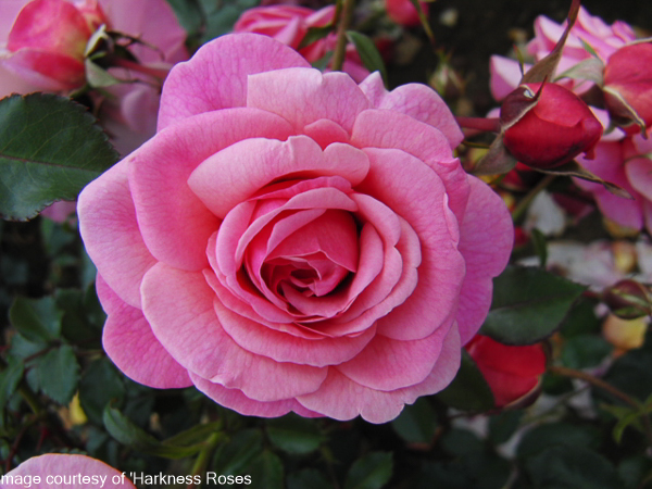 Rosa ‘Persian Mystery’ ‘Shrub rose: Hybrid Tea’. A bushy shrub rose with deep dusky rose pink blooms with deep red spot in the centre. Mildly fragrant. Repeat flowering. Ht: 80cm x 60cm.