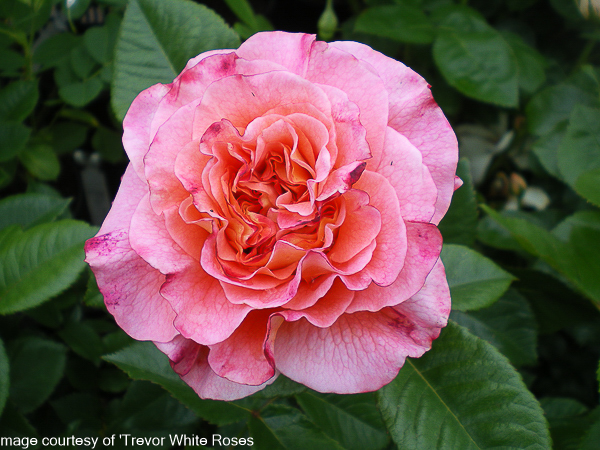 Rosa ‘Rachel’ Nostalgic Shrub Rose. Abundant, mid-green glossy foliage. Large, peachy pink, frilled blooms. Fragranced and repeat flowering. Ht 100cm x 50cm.
