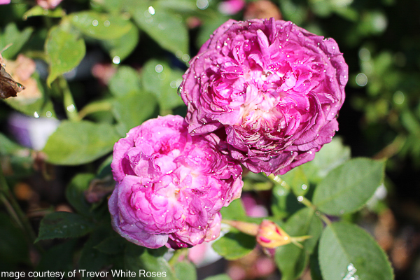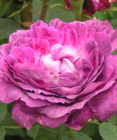 Rosa ‘Reine Des Violettes’ ‘Hybrid Perpetual’. Densely packed flws in shades of velvety lilac purple. Repeat flwing during summer. Very fragrant. Ht 5ft, spr 3ft. Superb in most soils.