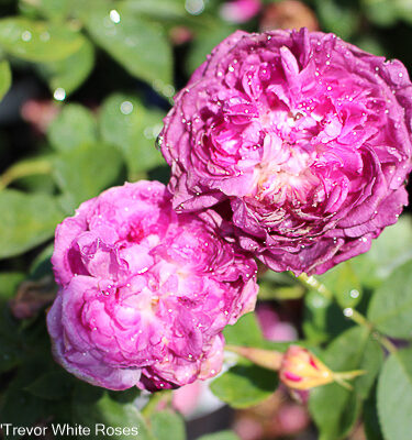 Rosa ‘Reine Des Violettes’ ‘Hybrid Perpetual’. Densely packed flws in shades of velvety lilac purple. Repeat flwing during summer. Very fragrant. Ht 5ft, spr 3ft. Superb in most soils.