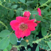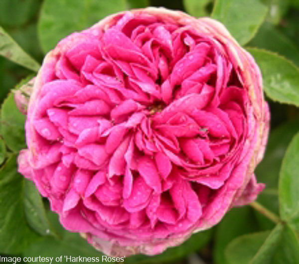Rosa ‘Rose De Rescht’ ‘Portland shrub rose’. A pretty shrub forming short bushy compact growth. Luxuriant foliage. Small neat pompon-like crimson flws with purple tints. Very fragrant. Repeat flowering. Ht 3ft x 2ft.