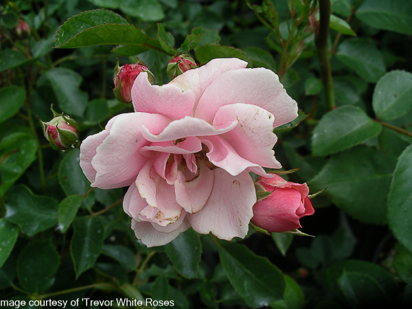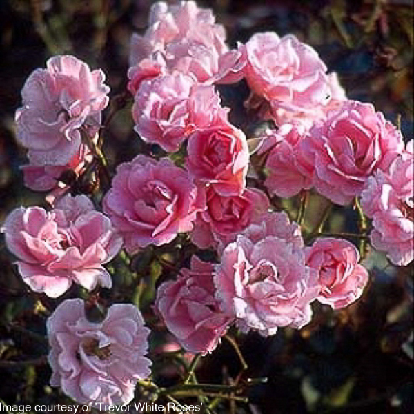 Rosa ‘Surrey’ ‘Ground cover’. Clusters of soft pink double flws. Continuously and free flowering all summer. Ht 2ft x 4ft. Tolerates shade. Suitable for planting in containers.