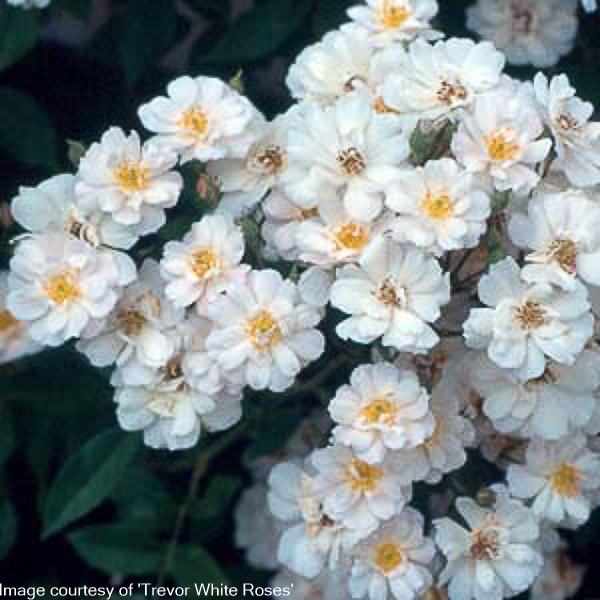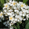 Rosa ‘The Garland’; ‘Rambler’ A vigorous spreading rambler. Masses of small semi-double creamy-white tinted pink daisy like flws in mid-summer. Scents of orange. Ht 4.5m x 3m. Lovely growing through trees or shrubs. Shade tolerant. Very hardy.