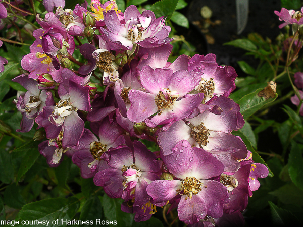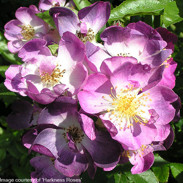 Rosa ‘Veilchenblau’ A vigorous rambler. Masses of unusual semi double purple violet flws with white centres, very scented. Lovely old fashioned colour better in shade. Ht 15ft. Suitable for north aspect. Will tolerate poorer conditions.