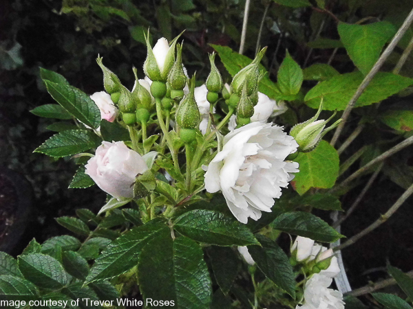 Rosa ‘White Grootendorst’ ‘Rugosa’. Sport of “Pink Grootendorst”. Very pretty, small, double, carnation-like fragrant, white flowers. Bright green foliage. Ht 4ft (1.2m) x Spr 3ft (90cm). Tolerates poorer soils. Suitable for pot culture or small hedge.