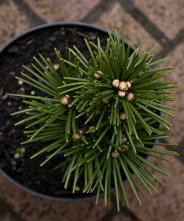 A new dwarf form with dark green needles, broad pyramidal habit. In 8 years 25-30cm high, 20-25cm wide. Collectors plant.