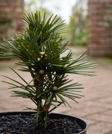A new dwarf form with dark green needles, broad pyramidal habit. In 8 years 25-30cm high, 20-25cm wide. Collectors plant.