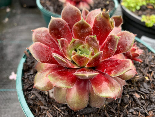 Large, deep red rosettes. The star shaped, generally pink flowers, are attractive but the plants are mainly grown for their colourful foliage. Ranges in size from 10-12cm (4″ to 5)